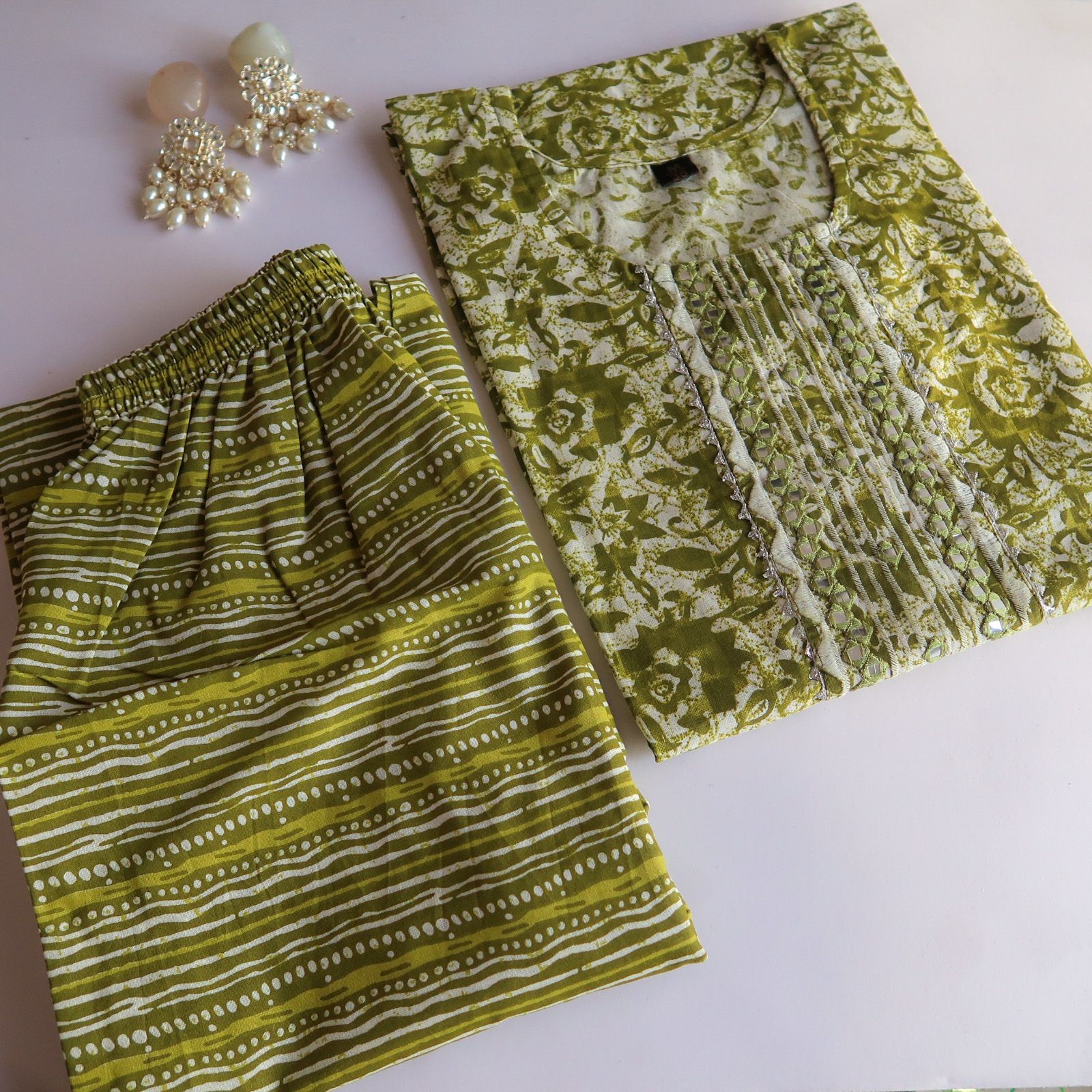 cotton kurta with cotton pants, Half drawstring and half elastic closure.