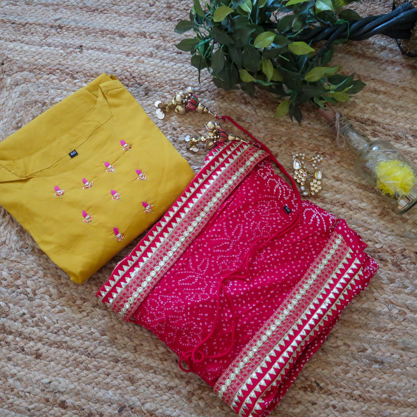 Must have 2 piece set for upcoming festivals. Pair it with minimal accessories and juttis to create a statement look. This 2 piece includes ankle length Gown with bandhej mirrorwork jacket which looks so classy.