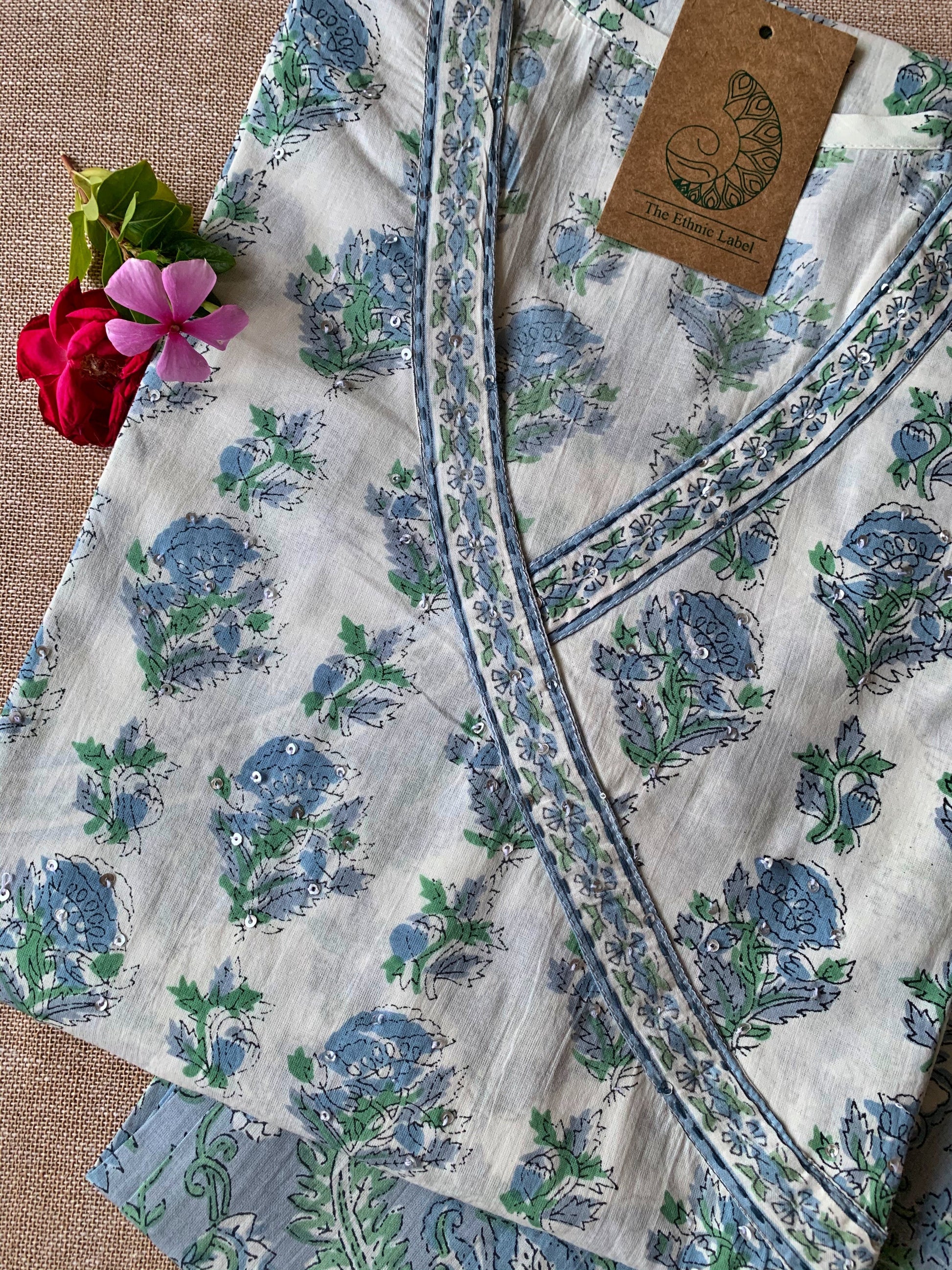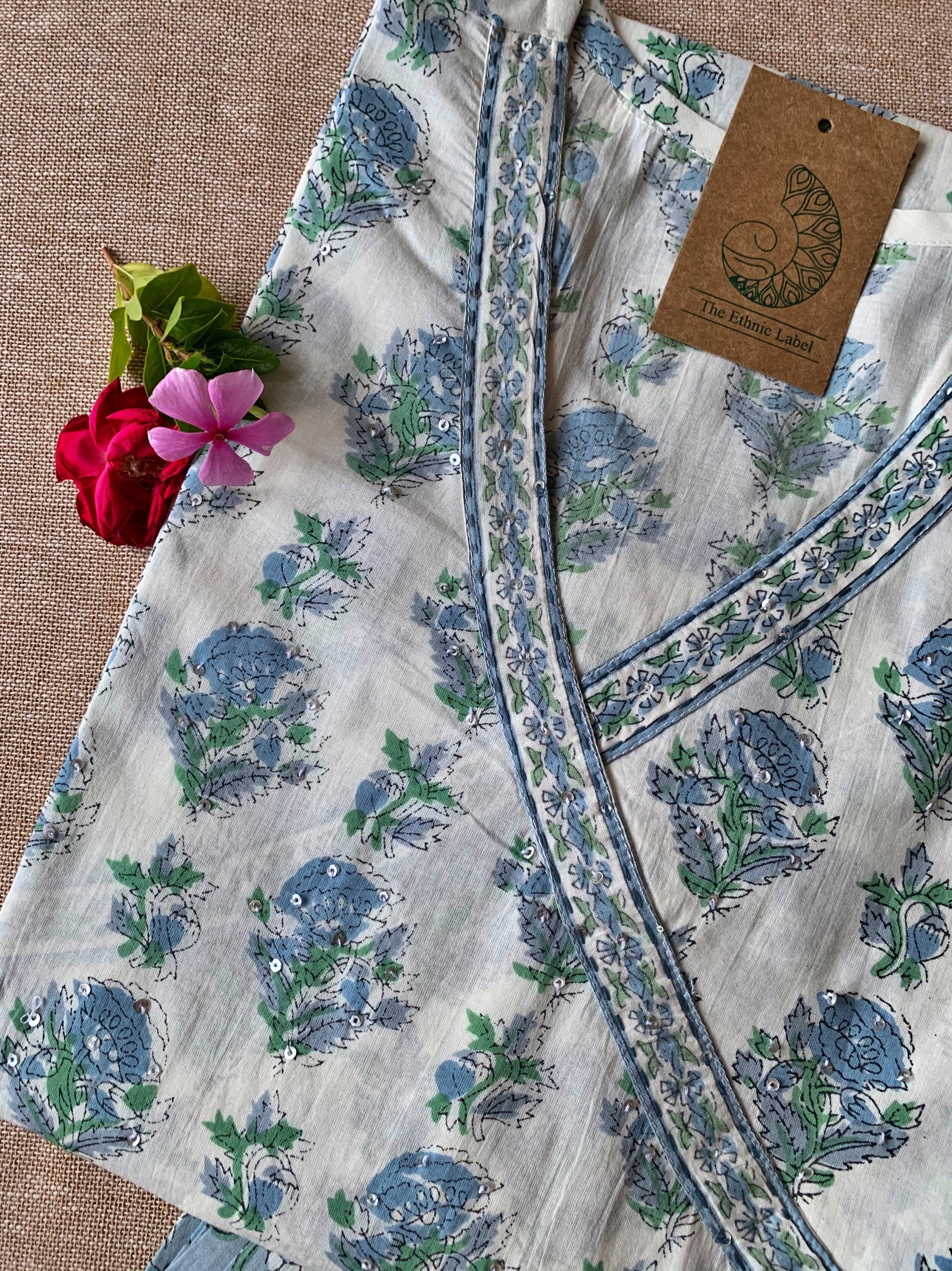 White Blue "Aasman" Angrakha Cotton Kurta Set - 2 pc