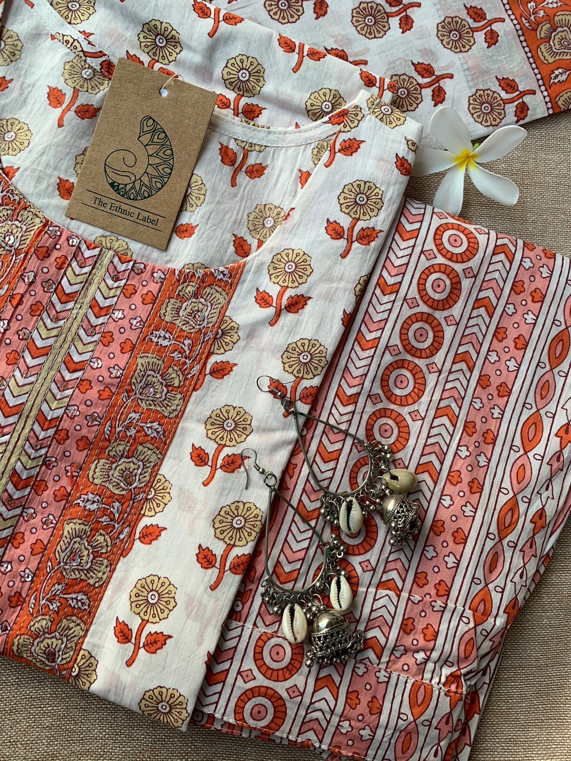 A three-piece set comprising a hand block printed straight kurta, straight pants with minimalistic details and cotton dupatta. This vivacious kurta set is a must-have in your wardrobe for the festivals and weddings you are going to attend. Accessorize it with your heavy jewellery and your magnetic smile and make all the eyes turn towards you.